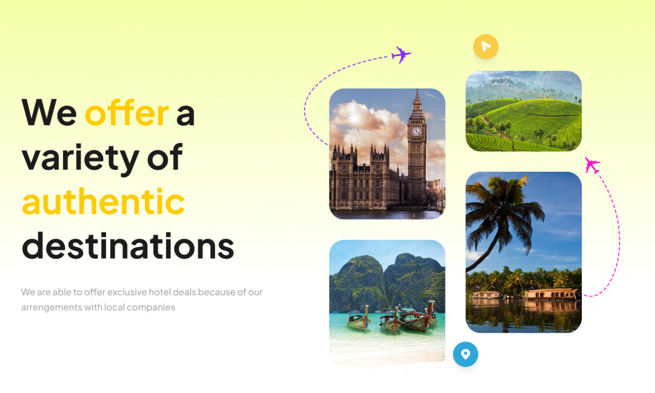 Our approach focused on trust, clarity, and visual exploration. A yellow-led brand palette reinforces warmth and confidence, while structured layouts, destination visuals, and strong calls-to-action create a secure, business-like experience tailored to millennial travelers.